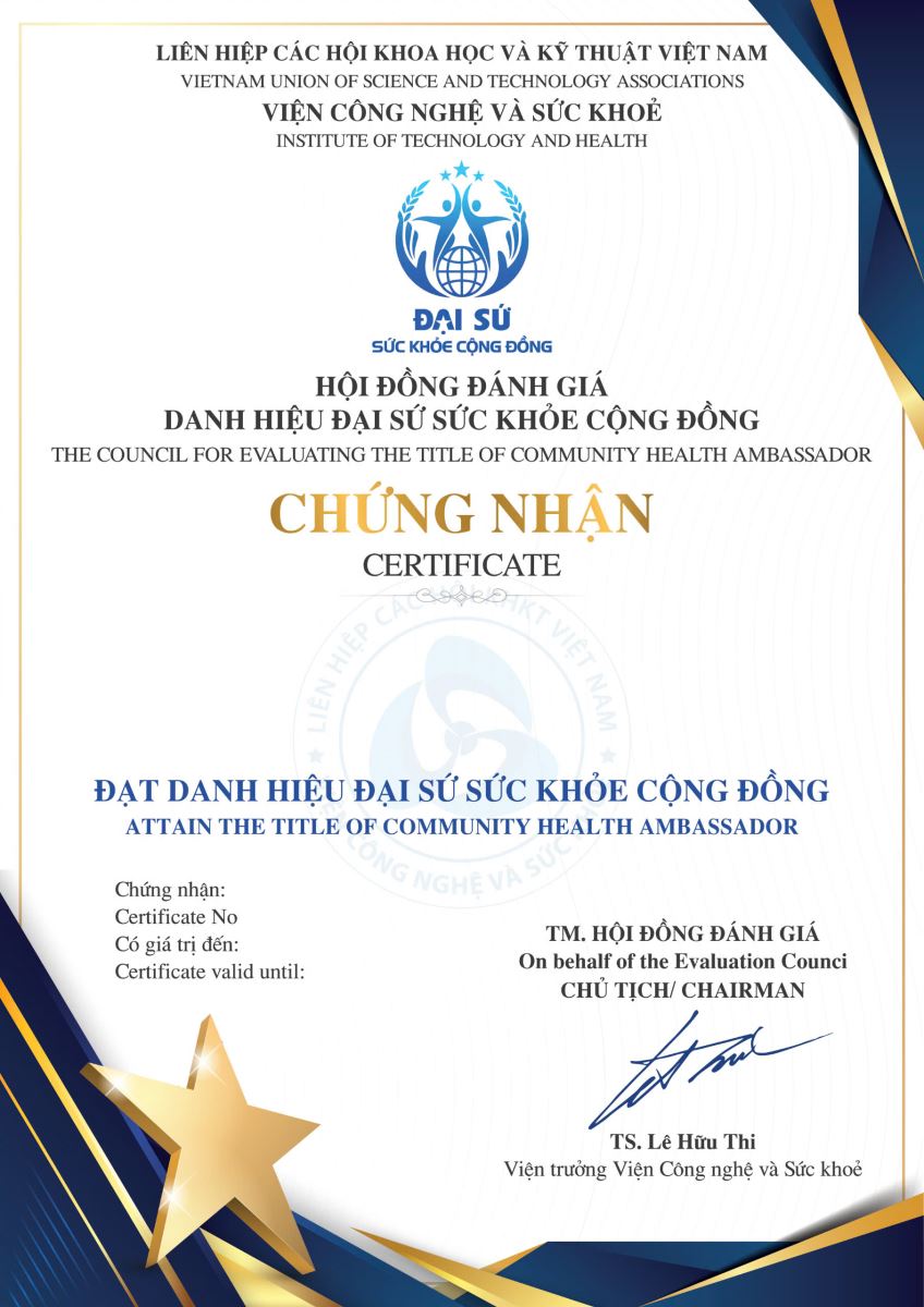 Nhằm ghi nhận và lan tỏa các mô hình, sáng kiến hiệu quả trong lĩnh vực này, Viện Công nghệ và Sức khoẻ – trực thuộc Liên hiệp Các hội Khoa học và Kỹ thuật Việt Nam đã chính thức ban hành Danh hiệu “Đại sứ Sức khoẻ Cộng đồng” theo Quyết định số 37/QĐ/VCNSK ngày 22/10/2024.