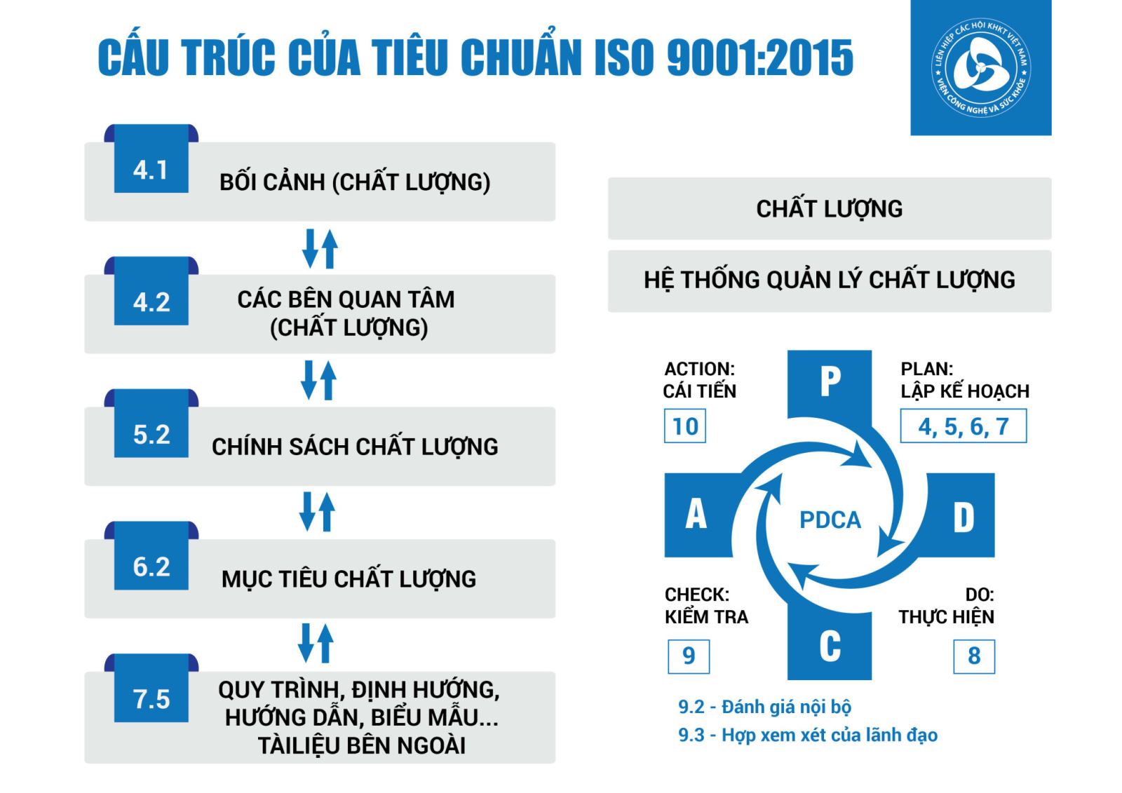 Bộ Khung chính trong Tiêu chuẩn ISO 9001 là theo nguyên lý cải tiến liên tục PDCA tức là Plan – Do – Check – Action (Lập kế hoạch – Thực hiện theo kế hoạch – Kiểm tra việc thực hiện có đúng theo hoạch định – Hành động đánh giá, cải tiến: